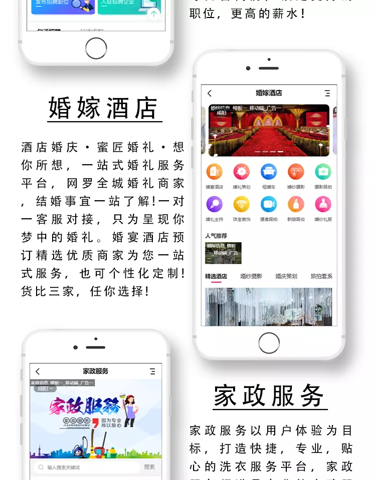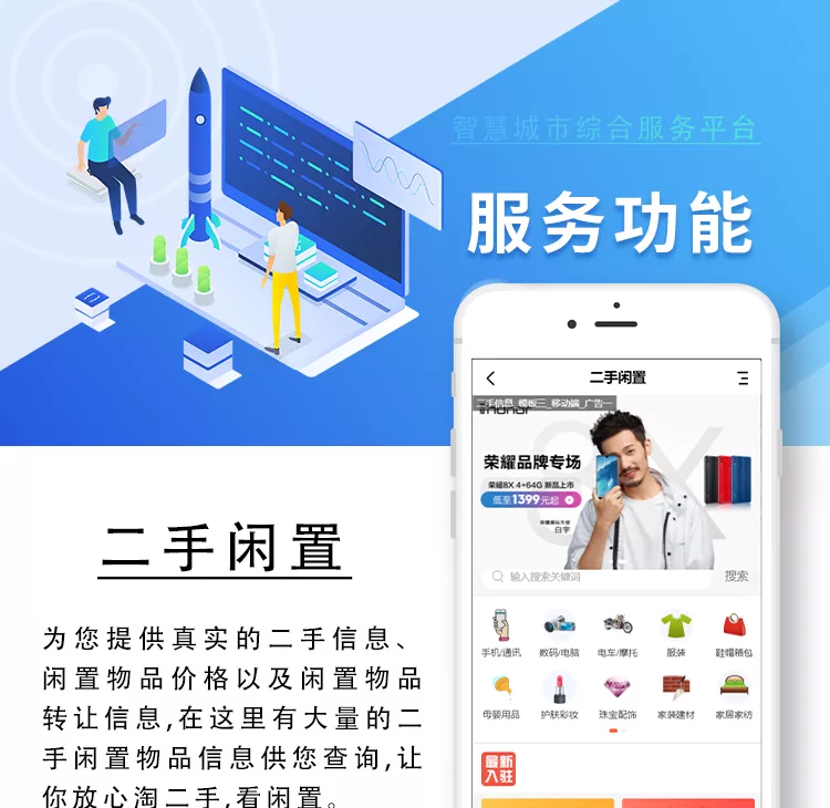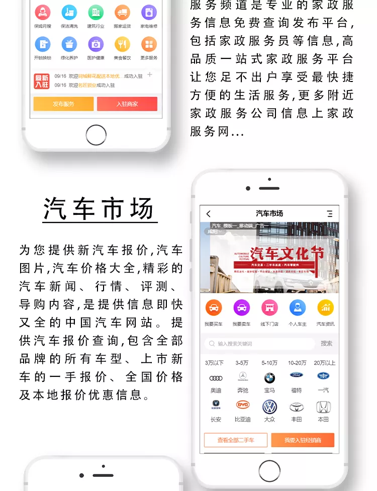 随着互联网经济的快速发展,目前也在快速的改变着人们的生活。为了给人们提供更好的服务,智慧城市综合服务平台由此诞生,智慧城市综合服务平台是一个大型的线上一站式门户服务平台,目前涵盖二手信息,商城,房产,招聘,婚嫁,家政,汽车,积分,教育,旅游度假,新闻资讯,图说新闻,同城活动等,让您快速找到就近的医院、酒店、银行、学校等生活服务机构。